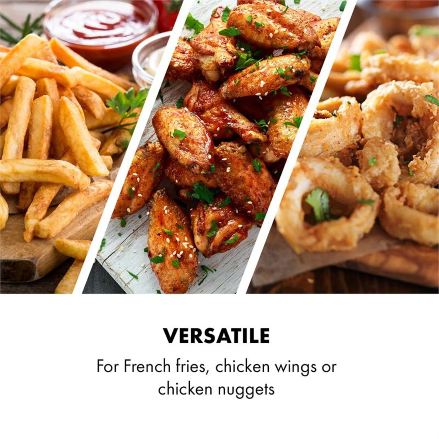 Dank des Klarstein Frittierkorbs können mit der AeroVital Cube Chef Heißluftfritteuse knuspriger Pommes frites, Chicken Wings oder auch Chicken Nuggets zubereitet werden.