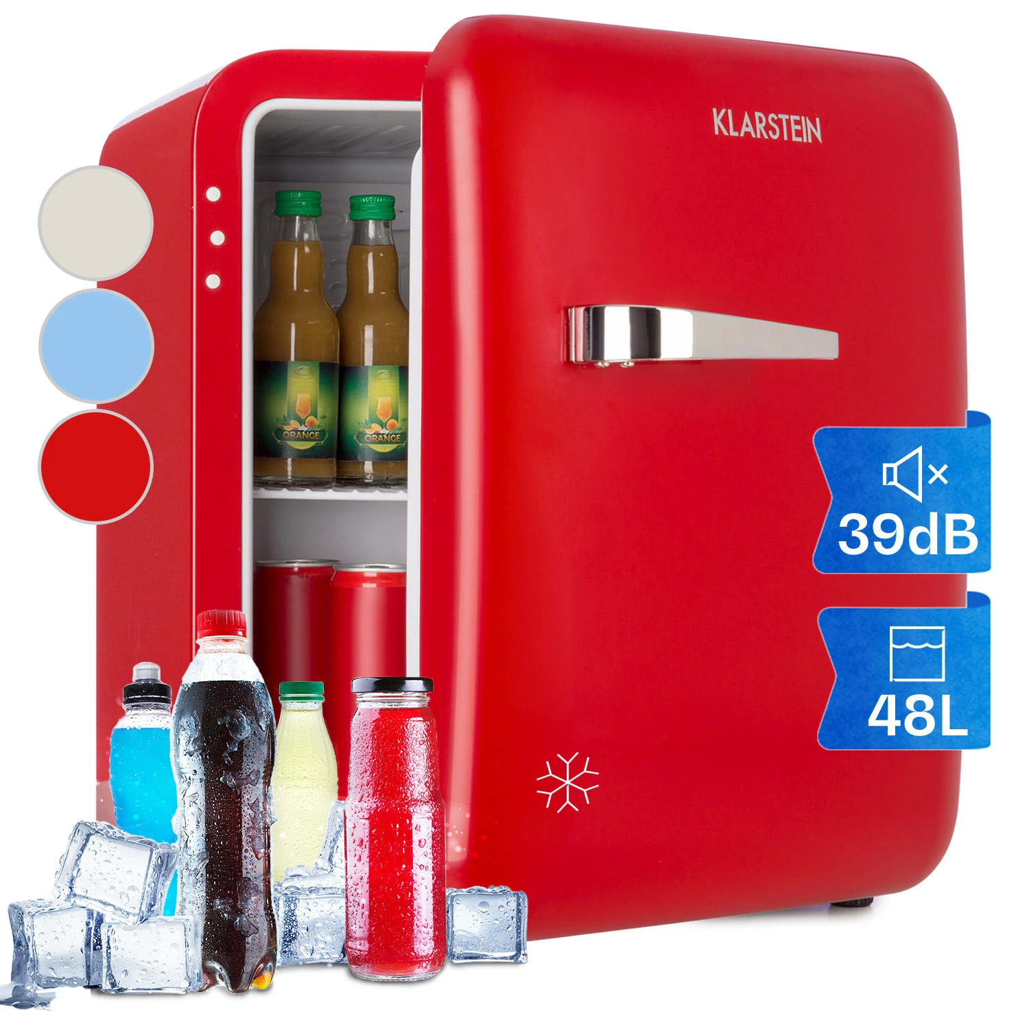 Der Klarstein Audrey Mini Kühlschrank versprüht farbenfrohen Retro-Look! Selbst bei kleinstem Platzbedarf kannst du dir mit kühlen Snacks oder Getränken das Leben verschönern. Dabei verleiht der ausgefallene Retro-Mini-Kühlschrank mit seiner peppigen Aura jeder Single- und Kleinfamilienküche, jedem Gästezimmer oder Wochenendhäuschen herzlichen Charme. 48 Liter Stauraum bieten viel Platz und für Ordnung sorgen 2 Ebenen sowie 2 Türfächer für Flaschen, Gläser und Dosen.