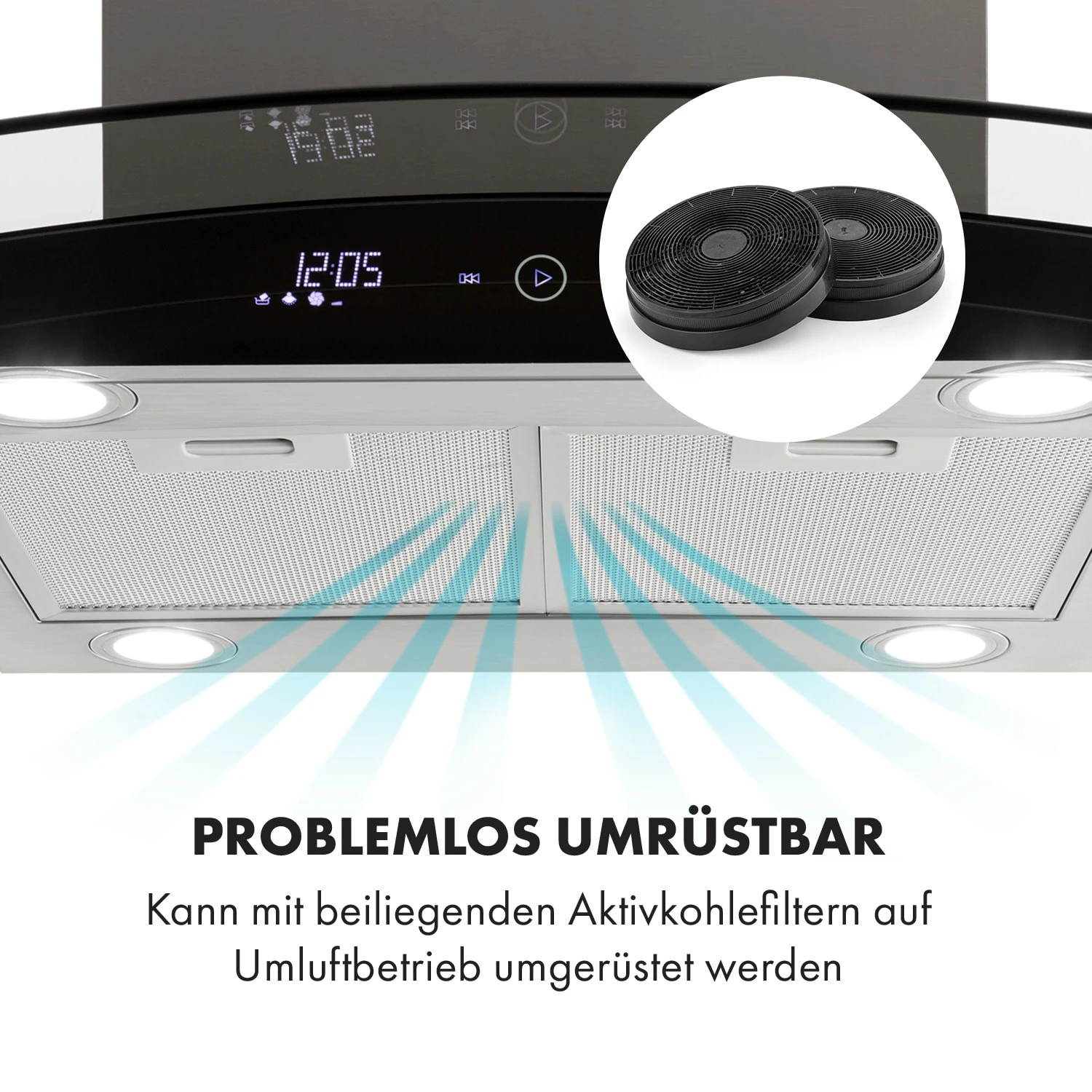 Die Dunstabzugshaube kann mit Hilfe der beiliegenden Aktivkohlefilter auf Umluftbetrieb umgerüstet werden.