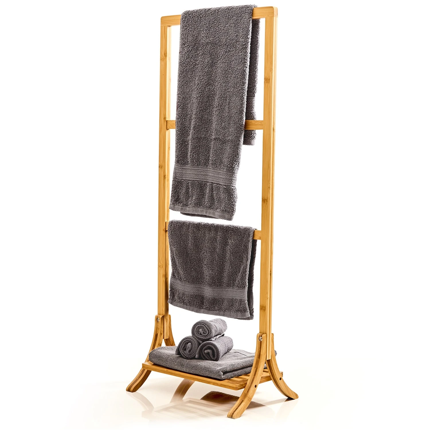 Das Besondere: die einzigartige Optik im Leiterdesgin! 3 unterschiedliche Handtuchstangen fügen sich hier akkurat zu einem Handtuchständer zusammen, verbunden durch die seitlichen Streben. Hier ist ausreichend Platz für kleine und große Badetücher geboten. Du kannst sie ideal ausbreiten, wodurch sie schnell und faltenlos trocknen. Die unterschiedlichen Höhen der Sprossen sorgen auch für Komfort. Denn die aufgehängten Badetücher kannst du so komfortabel mit nur einem Griff erreichen. Derweil bietet dir die untere Ablagefläche praktischen Platz: für Badeschuhe oder weitere Badezimmer-Utensilien.
