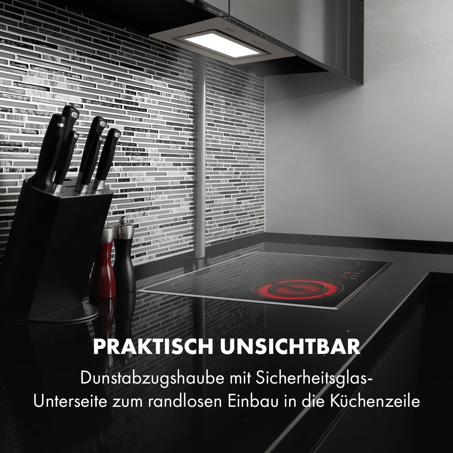 Beste Luft in deiner Küche: Der Klarstein Hektor Brilliant Edition Lüfterbaustein muss sich zwar nicht verstecken, tut es aber deiner Küchenzeile zuliebe und verschwindet randlos in der Küchenhänge. Von dort beseitigt er schwungvoll Dampf und Dunst beim Kochen.