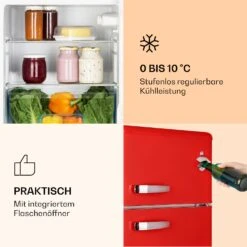 Die Klarstein Irene Kühl- und Gefrierkombination im Retro-Look verleiht deiner Küche mit ihrem peppigen Vint-Age Concept den sprühenden Charme der 50er-Jahre. Mit ihrem großen Innenraum hält sie viele Lebensmittel oder Vorräte lange frisch. Im Inneren kannst du gut für Ordnung sorgen, denn ein Gemüsefach und 2 Fächer in der Tür ergänzen den Stauraum der 2 bruchresistenten Glasablagen. Das topseitige 24-Liter-Gefrierfach komplettiert dein neues Kühlgerät.