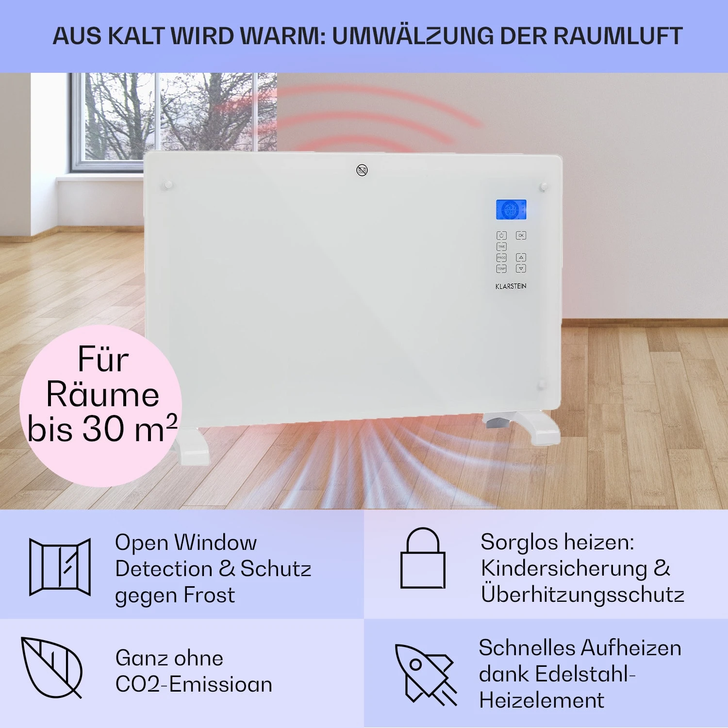Weiße Eleganz erweckt kuschlige Gefühle und wohlige Wärme für Pantoffelschlurfer und Pyjamaträger: Das Klarstein Norderney Konvektions-Heizgerät sorgt für eine gleichmäßige Temperaturerhöhung und Verteilung der Heizluft in Räumen bis zu einer Größe von 30 m² / 70 m³.