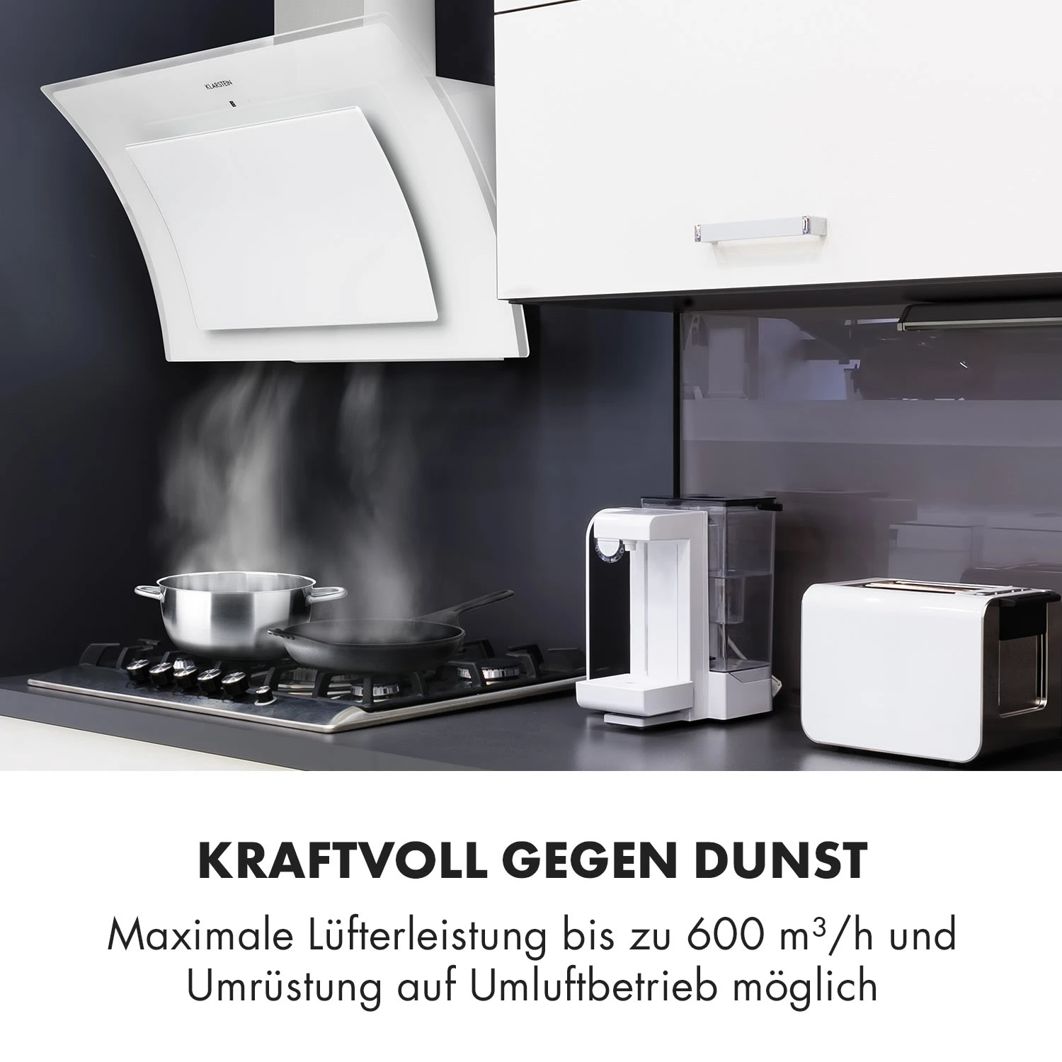 Jetzt kommen Schwung und Glanz in die Küche – und ganz nebenbei beseitigt die Klarstein Sabia Dunstabzugshaube auch Dampf und Essensgerüche.