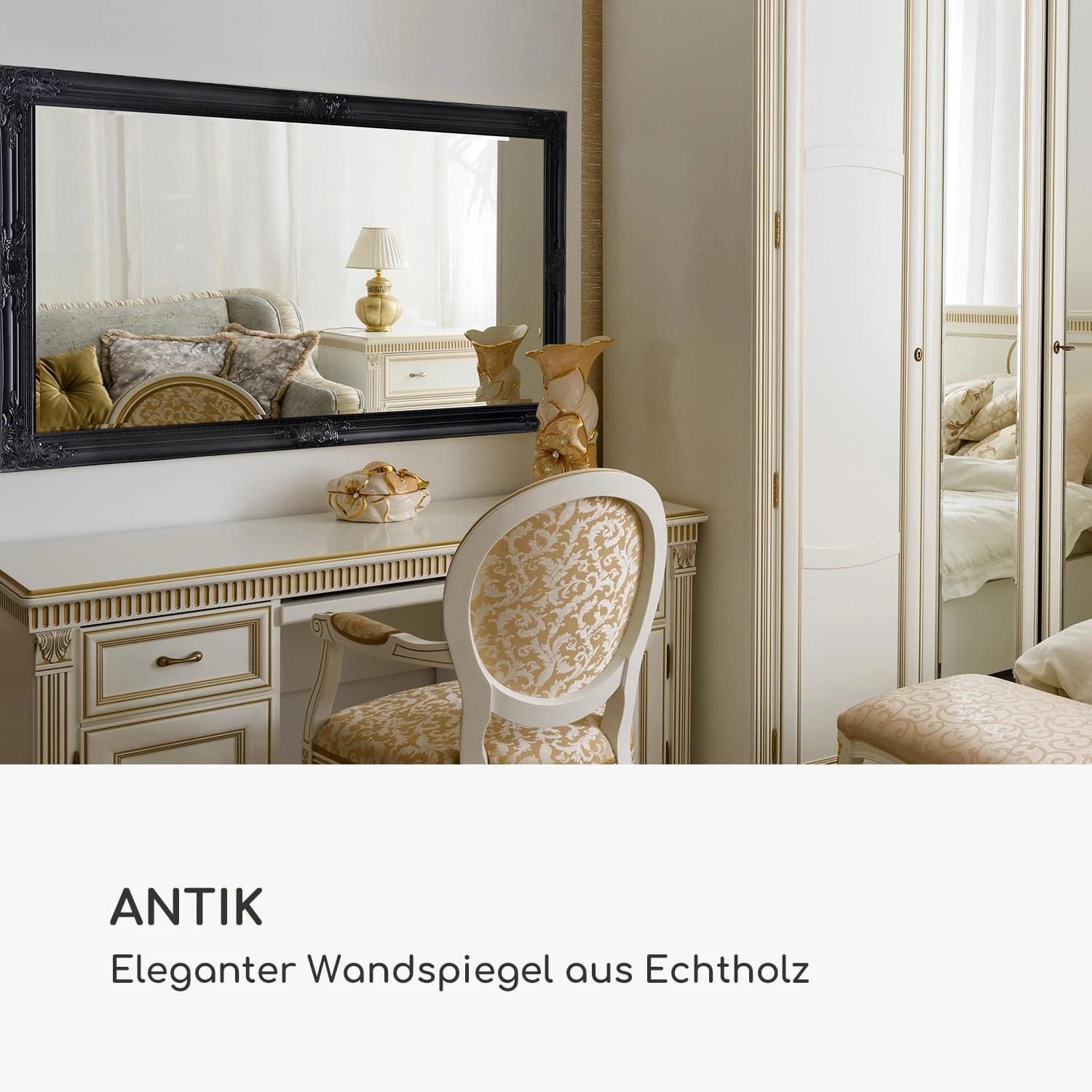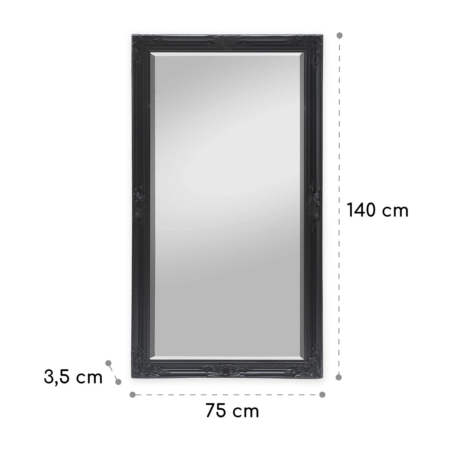 Der exklusive Wandspiegel Wembley von Casa Chick by blumfeldt verleiht jedem Raum einen luxuriösen Hauch von Rokoko. Kunstvolle Verzierungen säumen den gesamten Rahmen des Spiegels – durch zarte Formen und Linien wirken diese dezent pompös und sind ein wunderschönes Detail für alle Liebhaber antiker Epochen. Dank seiner Größe ist der elegante Spiegel ideal für den Eingangsbereich, das Wohn- oder auch das Schlaf- und Ankleidezimmer in deinem Zuhause. Du kannst ihn sowohl im Quer- als auch im Hochformat aufhängen. Ebenso kannst du ihn auch stehend nutzen und deinen Raum mit ihm dekorativ gestalten. Rückseitig sind die entsprechenden Aufhängungen für eine sichere Montage an der Wand bereits vorhanden. Das hochwertige Spiegelglas in 4 mm Stärke schenkt dir ein realistisches Spiegelbild. Das Glas verfügt über konisch geschliffene Kanten, welche die Exklusivität des Spiegels gekonnt untermalen.